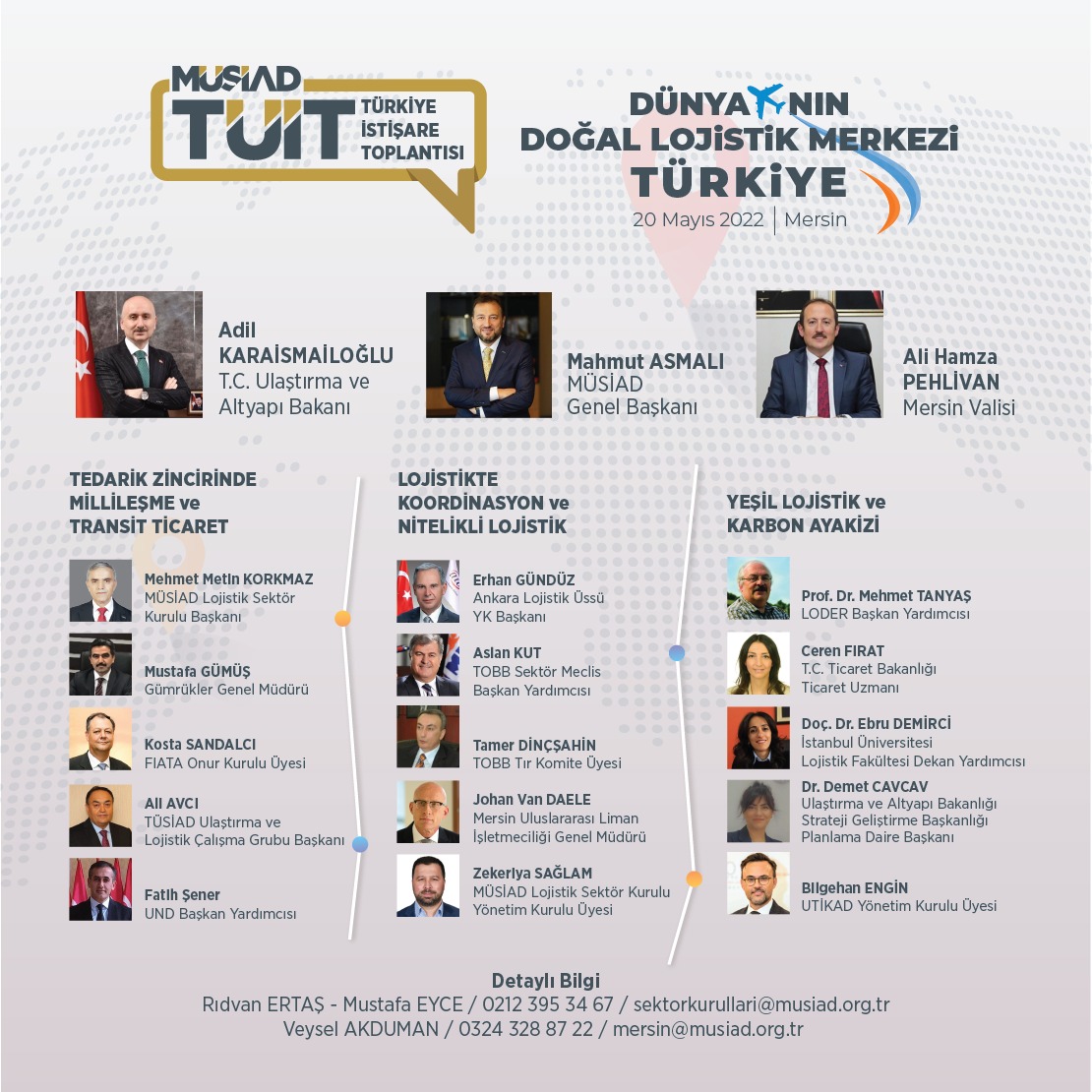 MÜSİAD Sektör Kurulları ve İş Geliştirme Komisyonu tarafından MÜSİAD Mersin Şubesi ev sahipliğinde 'Dünya'nın Doğal Lojistik Merkezi Türkiye' temasıyla Türkiye İstişare Toplantısı (TÜİT) düzenlenecektir. Toplantı, 20 Mayıs 2022 günü saat 09:00'da Mersin Divan Otel'de gerçekleştirilecektir.