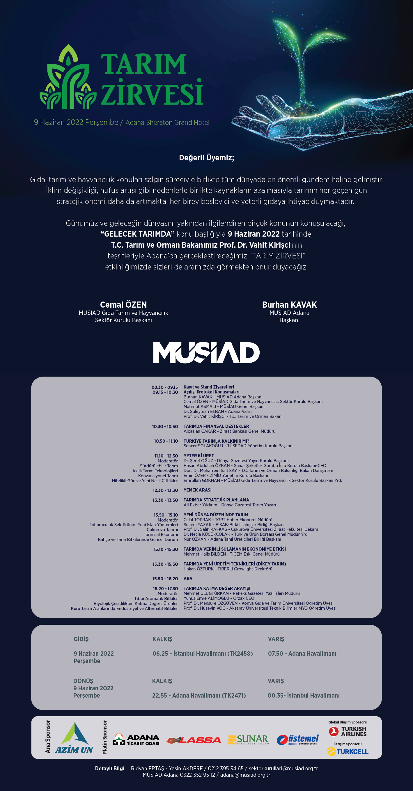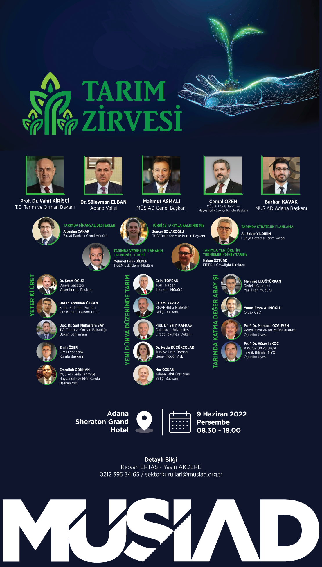 MÜSİAD Gıda, Tarım ve Hayvancılık Sektör Kurulu tarafından düzenlenen MÜSİAD Tarım Zirvesi, T.C. Tarım ve Orman Bakanı Sayın Prof. Dr. Vahit Kirişci'nin ve birçok panelistin katılımıyla "Gelecek Tarımda" başlığıyla 9 Haziran'da Adana'da düzenlenecek.