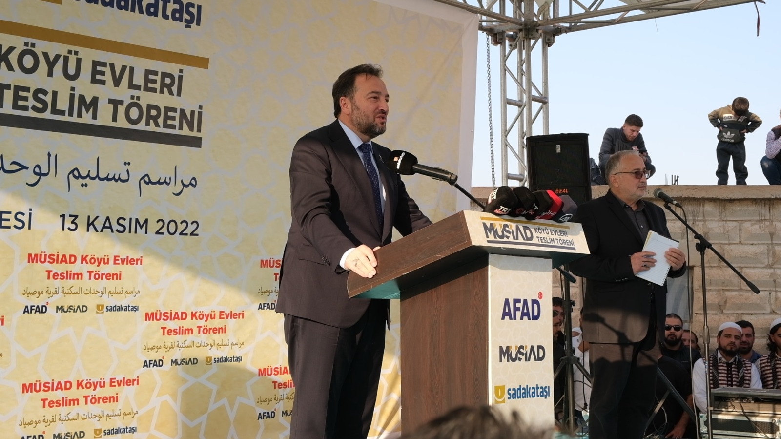 Suriye'nin kuzeybatısındaki İdlib kentine bağlı Meşhed Ruhin bölgesinde gerçekleştirilen proje kapsamında inşa edilen 600 briket ev, İçişleri Bakanı Süleyman Soylu, MÜSİAD Genel Başkanı Mahmut Asmalı, AFAD Başkanı Vali Yunus Sezer ve Sadakataşı Derneği Başkanı Kemal Özdal'ın törenle hak sahiplerine teslim edildi.