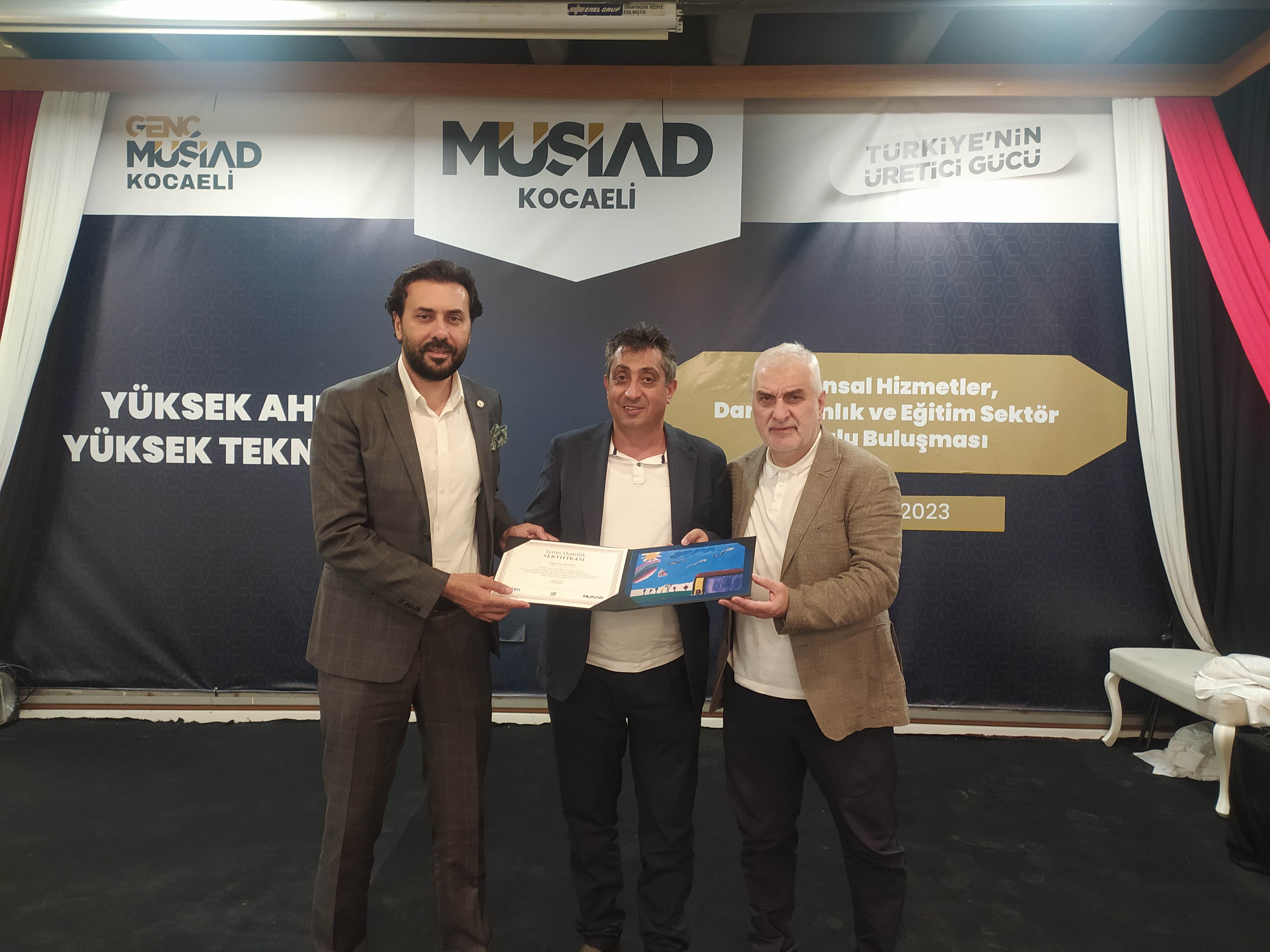 Finansal Hizmetler Danışmanlık ve Eğitim Sektör Kurulu Başkanı Hasan Ekmen, Kocaeli MÜSİAD Şube Başkanı İsmail Uslu’ya yetim sertifikası takdim etti.